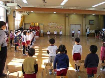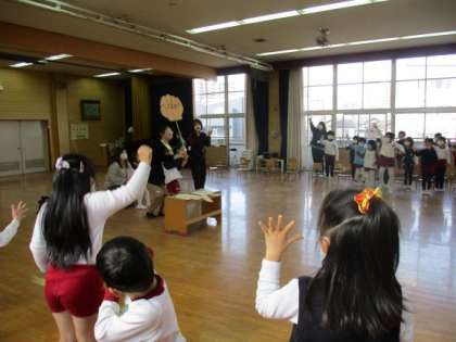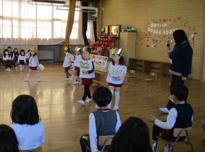 誕生児は、”お花”と”鬼”のペンダントをそれぞれもらったり、園長先生からの「春ですよ」の歌に合わせたペープサートをもらったりしました。また、友達からの歌のプレゼントやお家の方からの「おめでとう」の言葉を聞き、とても嬉しそうな表情でした。