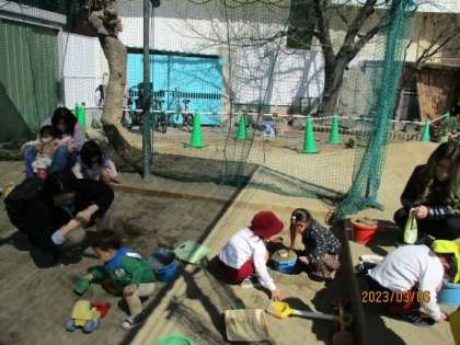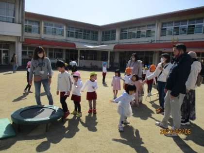 未就園児のお友達は、在園児と砂場で遊んだり、トランポリンや平均台などの遊具で遊んだり、絵をかいたりと様々遊びを楽しんでいました。