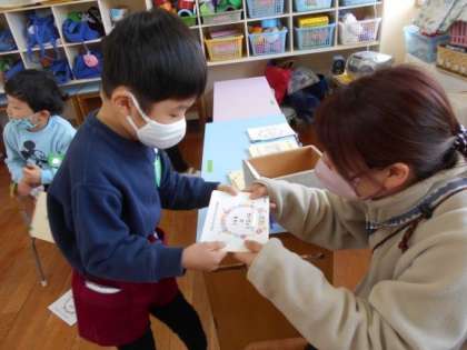 養護教諭から5歳児に幼稚園の入園から修了までの身長体重を比較した『せいちょうのきろく』をプレゼントしました。