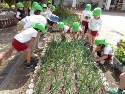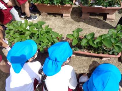 お庭には、魅力的な自然物がたくさんあり、5歳児はイチゴやタマネギの様子を観察したり、匂いを嗅いだりし、これからの収穫を楽しみにしていました。