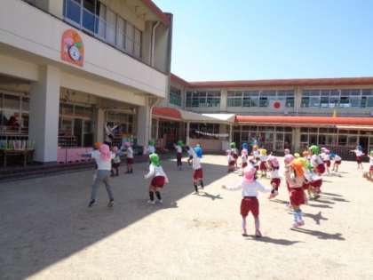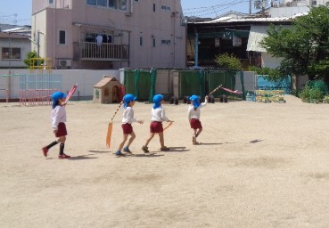 5歳児あやめ組が、自分なりに工夫してつくったこいのぼりを持って元気いっぱい走っていました。