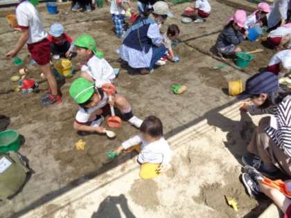 在園児と一緒に砂場で遊んだり、園庭に咲いていた花を使って遊んだり、サーキットで遊んだりしていました。