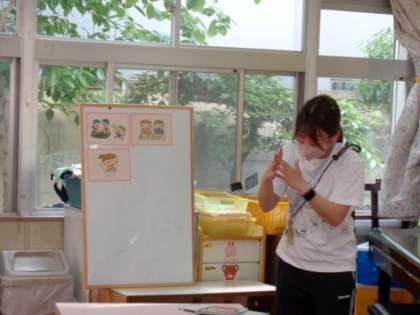 外から帰った時、トイレの後、ご飯・おやつの前に手洗い、うがいをすることを伝え、「あわあわてあらいのうた」に合わせて手洗いのやり方を知らせました。