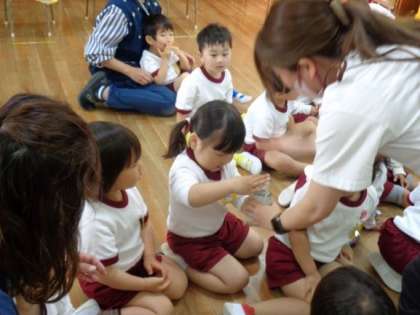 また、幼稚園のほとんどがハンドル式の蛇口なので、子ども達が自分でハンドルを回せるように、模型を活用し回す練習をしました。