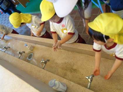 保健指導後の外遊びから帰ってきた時、話を思い出しながら丁寧に手洗いする姿が見られました。
