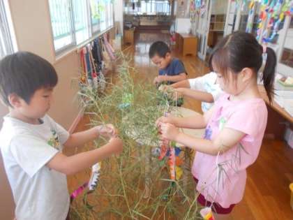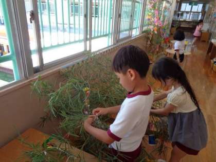 その笹に「願いが叶いますように」と七夕飾りを結びました。