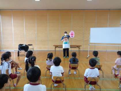 エプロンシアターでは、虫歯について、よく噛んで食べる大切さについて教えてもらいました。「うがいたいそう」で口の中の唾液を増やし、虫歯を予防できることも知ることができました。