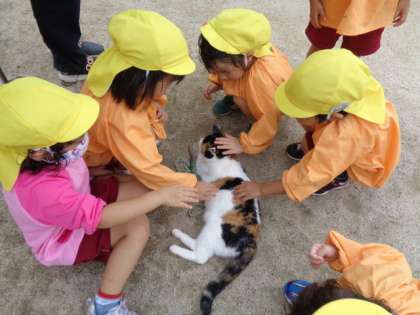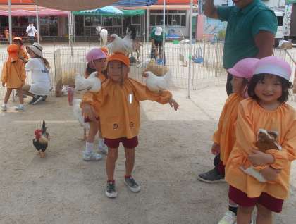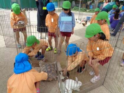 「この子ふわふわしてて気持ちいいよ」「手のひらがこしょばいね」など友達や先生と話しながら動物と触れ合っていました。また、チャボを頭にのせたり、ヘビを首に巻いたり、ご飯をあげたりなどたくさんの経験をすることができました。