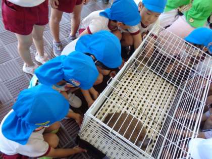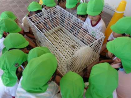 5歳児のゆり組・あやめ組が力を合わせてケージを運んでくれました。