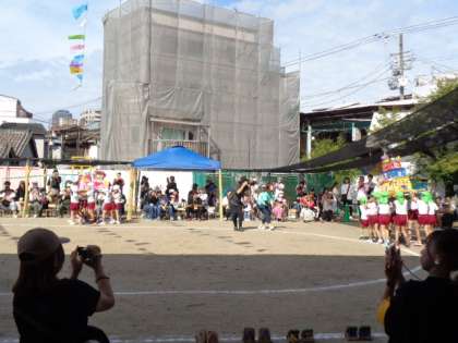 プログラム3番の「お祭りわっしょい」では5歳児が友達と相談しながら一生懸命につくったお神輿を担いで、登場しました。