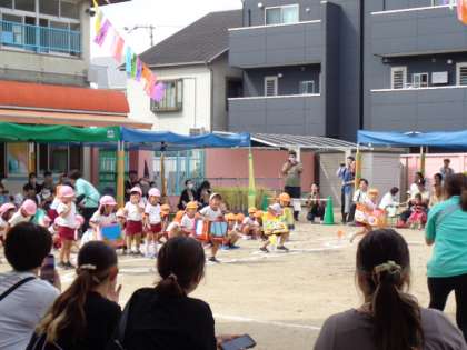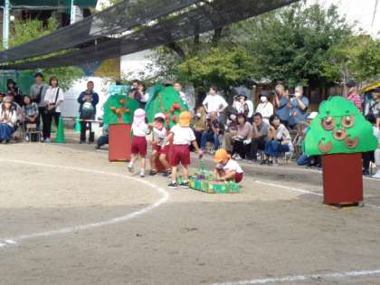 プログラム4番、4歳児「くだもの列車」では、さくら組とたんぽぽ組、それぞれのクラスで飾りつけしたカラフルな電車に乗って、果物狩りに出かけました。