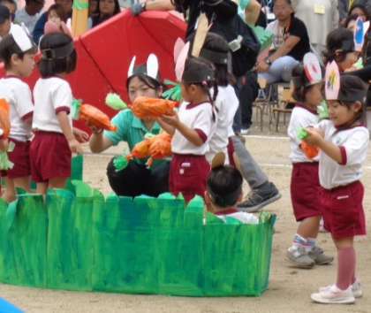プログラム5番、3歳児「ウサギのおでかけ」では、可愛いウサギさんたちが元気に登場してきました。