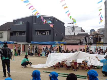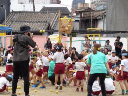 プログラム6番、5歳児「城東ソーラン」は、城東区のオリジナルソーラン節です。4歳児の時から5歳児に憧れ、繰り返し踊ってきました。自分で絵をかいた法被を着て、最後まで、かっこよく踊ることができました。