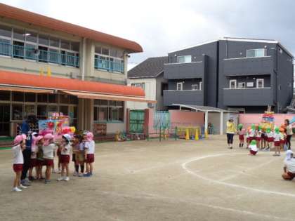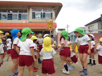 今日は、園庭で玉入れをしたり、5歳児が誘ってくれてパラバルーンに挑戦したり、おみこしを担がせてもらったりしました。