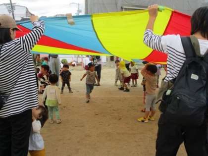 「ワイワイ運動会」の体操をして、5歳児がパラバルーンを見せてくれたり、一緒にパラバルーンを使って遊んだりしました。