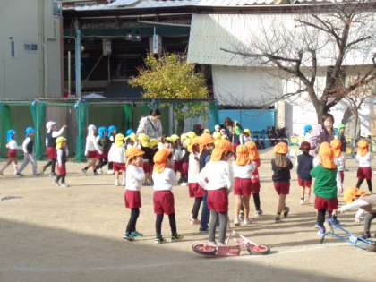 保育室や園庭で好きな遊びをしている時にベルがなりました。