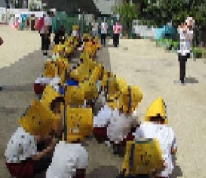 子ども達は、非常ベルや放送内容をよく聞き、防災頭巾を被って、安全に園庭へ避難しました。その後、津波が来ることも想定し、城東小学校へ2次避難しました。
