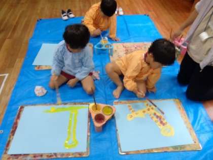 昨日園外保育で行った天王寺動物園の動物たちを思い浮かべ、「クマがボールで遊んでいるところが面白かった」「キリンのしっぽは細かった」「フラミンゴ、ピンク色でかわいかった」など、興味関心をもったところを絵で表現していました。