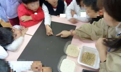5歳児の子どもは、もち米とうるち米(精米したものと、園で脱穀したもの)を見比べていました。「もち米の方が白くてちょっと丸い」「お家で食べるお米は、もち米や脱穀したお米よりも透明」と気付いたことを伝え合っていました。