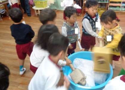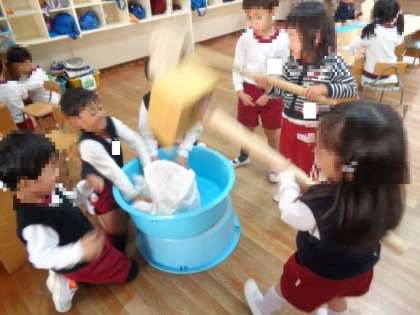 3・4歳児は、手づくりの杵と餅を使って餅つきごっこを楽しんでいます。本当の餅つきの時は大人が餅をひっくり返す「返し手」をするのですが、餅つきごっこでは、昨年度の経験がある4歳児の子ども達が器用に餅を返していました。
