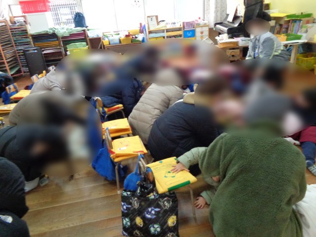 その後は、保護者の方も一緒に地震を想定した避難訓練を行いました。これを機に、お家でも火事や地震の時に身を守る方法について話し合ってください。