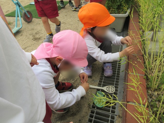 菜の花が咲いた後、サヤができているのを見つけた子どもが、「マメができてる」と収穫し始めました。