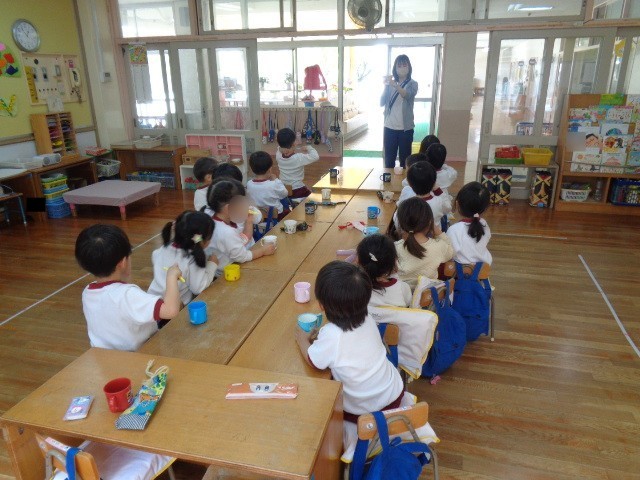 4歳児は、音楽に合わせて先生と一緒に行っています。