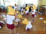 テラスでは、4歳児が5歳児に憧れオリジナルはっぴを着て城東ソーランを踊っています...