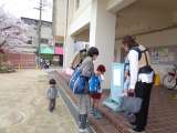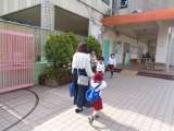 5歳児が登園後、門に立ち「おはようございます」と元気に挨拶しています。 挨拶の...