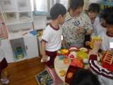 3歳児ひよこ組の子どもたちを見に行くと…。 お部屋ではお絵かきやブロック、まま...