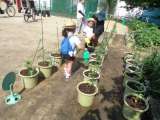 登園時に、3・4歳児がお家の方と夏野菜の苗を植えました。 「大きくなあれ」と声を...