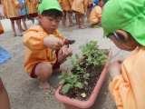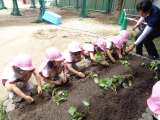 さくら組がサツマイモの苗植えをしました。 苗に優しく土の布団をかけ「大きくなーれ...