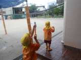 登園してしばらくすると、突然大雨が降りだしました。 3歳児の子どもたちは、「わあ...