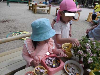 幼稚園には自然がいっぱい! 公開日 2024/04/26 更新日 2024/04/26 チューリップクラブ 園庭では、在園の子どもたちが草花を使って遊んでいます。 その様子を見たちゅーりっぷクラブの子どもたちは 「お花屋さんしてみたいな」 と、お花を使ってごちそうを作っていました。 幼稚園にはウサギもいます。 「ご飯だよー!」と呼んで野菜のごはんをあげると、 ウサギも嬉しそうでしたよ。 <ちゅーりっぷクラブ実行委員会> いいね(0)