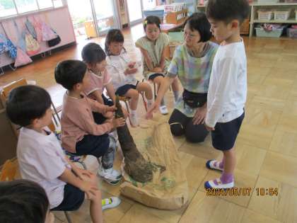 「お休みにおじいちゃんの所でたけのこを、採ってきました」と大きなたけのこを持ってきてくれました。たけのこ知ってる?と聞くと「チンジャオロースに入ってるよ」「もっと色は白っぽいよ」触ってみると「なんかふさふさしているね」等。食べたことはあっても、普段見る事が出来ない形を見れたり、触ったりして新しい発見が出来ました。