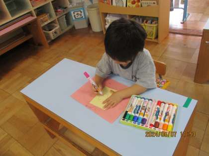 親子栽培で夏野菜を植えるので、自分のお野菜とわかるように名札を作りました。「僕はトマトー」「ピーマン食べれるよ」と親子栽培を楽しみにしている様子。名札には、好きな絵を描いて完成!明日の親子栽培がもっと楽しみになったね。