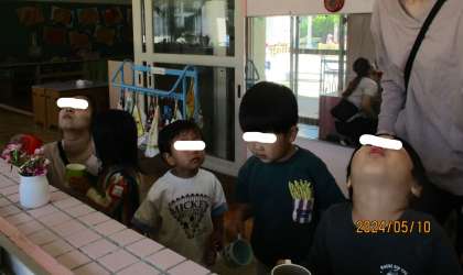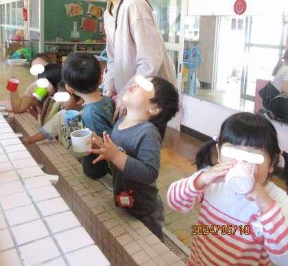 ばいきん、バイバイ! 公開日 2024/05/10 更新日 2024/05/10 チューリップクラブ ちゅーりっぷクラブのお友達は手洗いがとっても上手です。ばいきんが体の中に入らないように、今日はがらがらうがいの話をしました。 正しいうがいの仕方を知らせた後は、みんなで一緒にがらがらうがいにチャレンジ! 手洗い場の天井には、キャラクターの顔が見えます。キャラクターの顔に「こんにちは!」の挨拶をしながら、上を向いて上手にうがいができていました。 <ちゅーりっぷクラブ実行委員会> いいね(0)