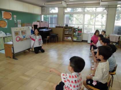 5月の保健指導(4・5歳) 公開日 2024/05/31 更新日 2024/05/31 保健室から 5月はトイレの使い方(スリッパの並べ方、和式トイレの使い方)の話をしました。 スリッパが綺麗に並んでいる写真とバラバラの写真を見比べ、どう並べれば次の人が気持ちよく使えるのかを考えました。また、園外保育に向けて、和式トイレの使い方をお知らせし、子どもたちからは「スリッパきれいに並べたよ」「和式トイレ使ってみる!」と伝えに来る姿が見られました。 いいね(0)