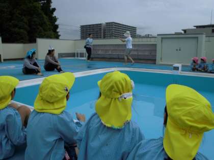 イカた君が間違えたことをしていると子どもたちから「プールの周りは走らないよー」「飛び込んだらダメー」「水を嫌がってる子に水を掛けたらだめだよ」と、教えてくれました。5歳児は、しっかり覚えている様子と、4歳児は、それを真剣に聞く姿が見られ今年も楽しくプールに入れそうです。