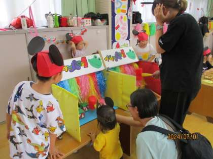 4歳児は受付を担当し、5歳児はお店屋さんになり、未就園児のお友達に優しく関わっていました。