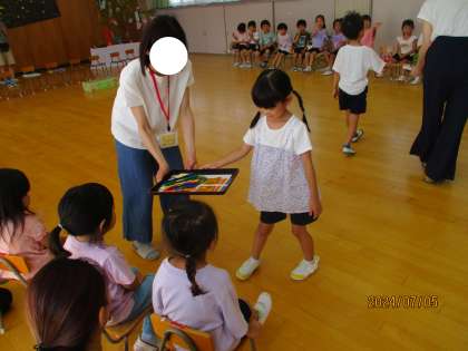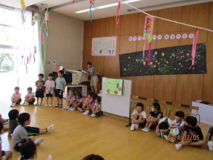 5歳児、4歳児、ちゅーりっぷクラブの6月・7月誕生会・七夕遊びをし、誕生児は七夕のお供えを持って入場しました。