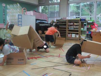 雨の日だって 公開日 2024/07/12 更新日 2024/07/12 幼稚園日記 昨日もあいにくの雨だったので、4歳児は幼稚園にあった段ボールを担任の先生が運んできました。 わーっと目を輝かせていた4歳児。 手にしたとたん、すぐに頭にかぶった友達を見て、みんなで大笑い。私も!僕も!と頭にかぶったり、中に入ったりして楽しんでいました。 途中から「救急車になったよ」と、他の素材を使って遊びが広がっていく姿が見られました。 4歳児の保育室からは元気な笑い声が聞こえてきました。 いいね(0)