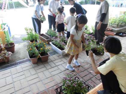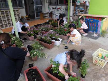 かわいい花の苗がたくさん届きました。預かり保育に参加していた子どもたちが「いっぱい色がある!」「黄色がきれい」と喜んで、大きいプランターに植え替えをしました。鶴見区の種花事業に参加し、年に2回、届けてもらっています。植え替えが終わると、子どもたちが「もっと、伸びて〜」と水やりもしました。