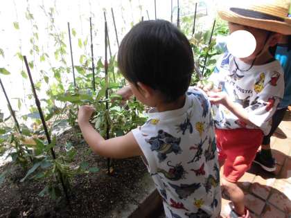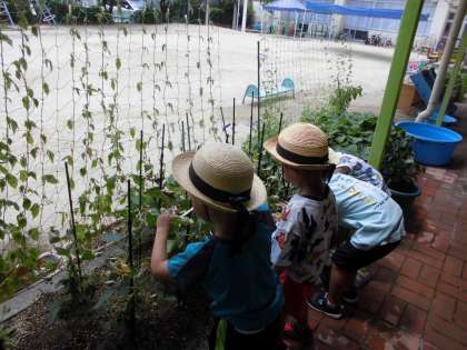 1学期中に植えた枝豆がプクプク膨らんで食べごろになってきたので、預かり保育に参加していた子どもたちと収穫しました。