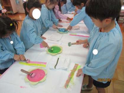 コロコロ楽しいな 公開日 2024/08/28 更新日 2024/08/28 幼稚園日記 今日4歳児、5歳児は敬老の日の集いに向けてプレゼント製作を行いました。 色々な色を画用紙にコロコロとローラーを滑らせます。 「虹色にしたーい」「全部まぜたいな」「おばあちゃん、おじいちゃん何色が好きかな」 と、喜んでもらいたい気持ちと楽しむ気持ちで、かわいい作品が出来上がりました。 手元に届くのを、楽しみにお待ちください。 いいね(0)