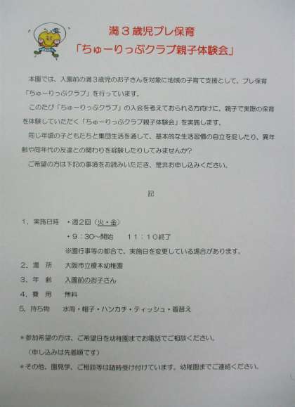 プレ保育「ちゅーりっぷクラブ」を行っています。