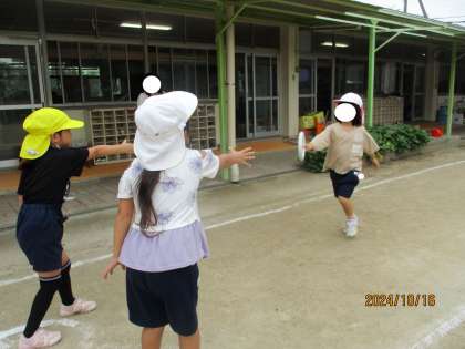 5歳児が4歳児を誘い、一緒にリレーをすることになりました。