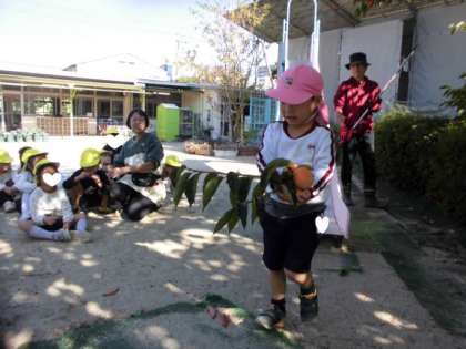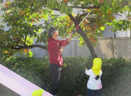 園庭にある柿の木に、たくさん大きな実がなっていました。