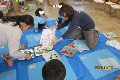 秋の自然を生かして、 公開日 2024/11/19 更新日 2024/11/19 幼稚園日記 子どもたちが、 かいたり、つくったりすることを 楽しむきっかけはいろいろです。 園内にある自然物から心を動かすことも。 綺麗な色の果物や、 いろいろな形の葉っぱ。 お芋のツル。 「不思議だなぁ」 「綺麗だなぁ」 「面白いなぁ」 子どもの心が動いてきます。 先生はそのきっかけづくり。 いいね(0)