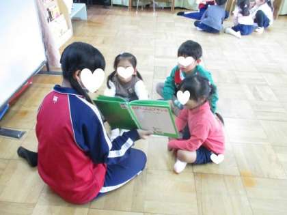 保育室では、数人ずつ分かれて絵本を読み聞かせてもらい、